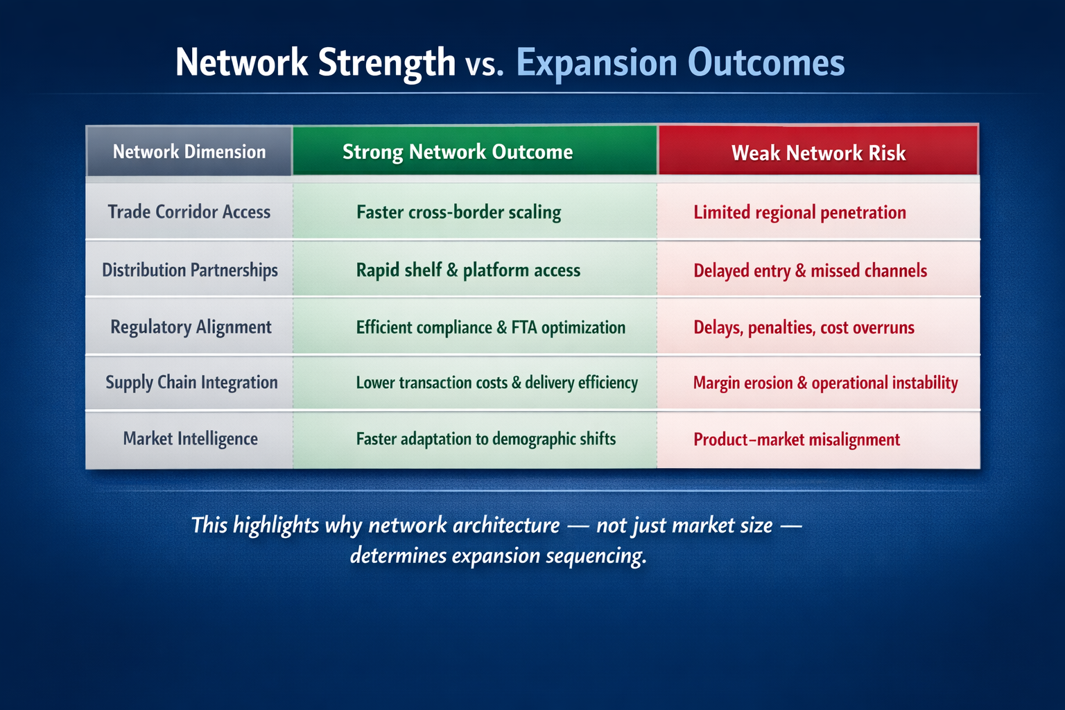 Conversely, companies entering without robust network architecture often face customs delays, regulatory friction, higher logistics costs, and slower market penetration — even when demand fundamentals are strong.